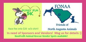 Lace up your sneakers and join FONAA for the Bunny Run 5K, a fun, family-friendly run or walk benefiting Friends of North Augusta Animals (FONAA). This community event is all about giving back—supporting local animals while enjoying a beautiful course and great company. Whether you’re racing, walking, or cheering from the sidelines, every step helps make a difference!