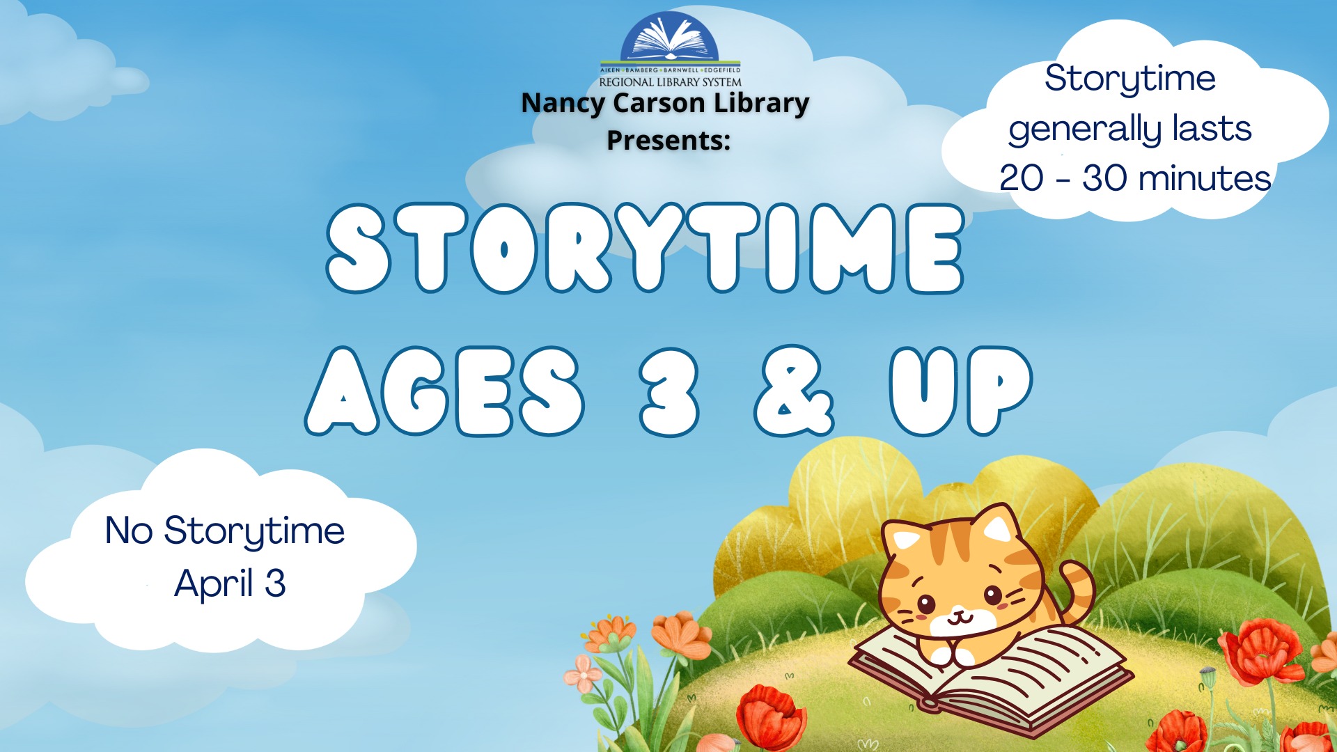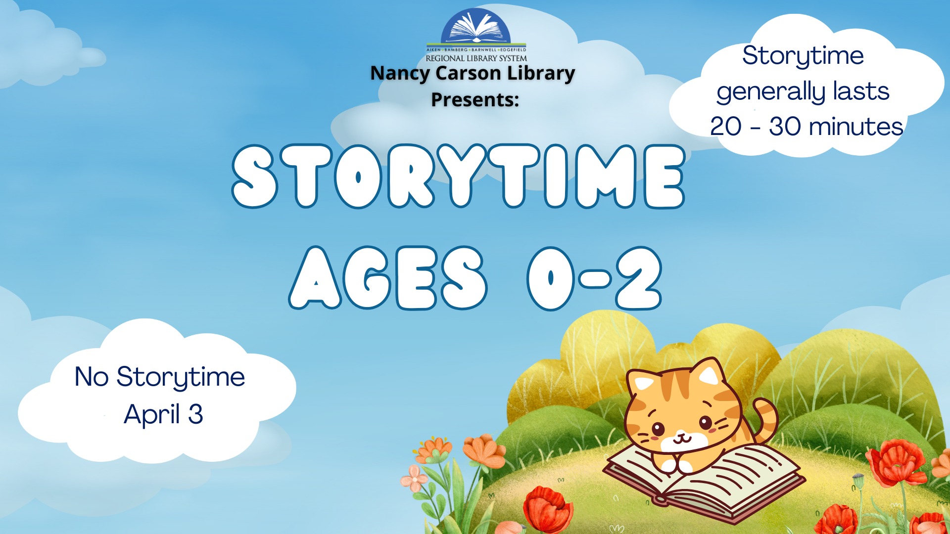 Join the Nancy Carson Library for fun stories, songs, and bubbles! No storytime Friday, April 3 due to the Good Friday holiday.