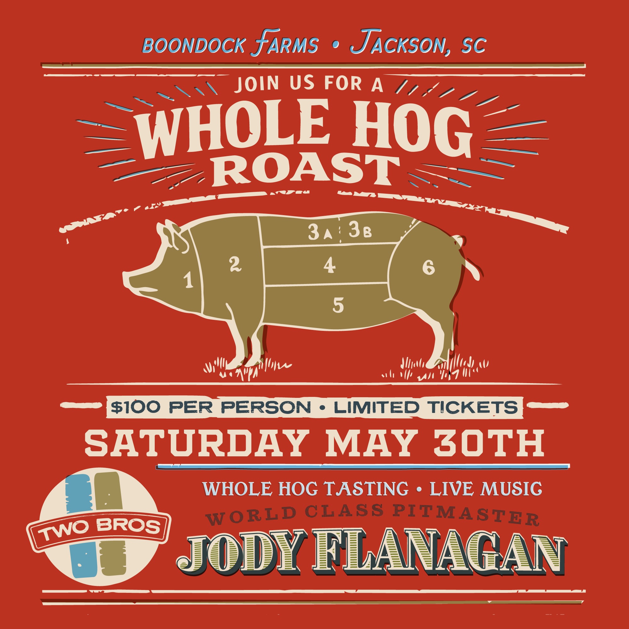 Join Boondock Farms for an unforgettable culinary experience at an exclusive Whole Hog Dinner Event unlike anything you’ve experienced before. Dinner guests will have the opportunity to taste multiple cuts from a single, whole animal—expertly prepared in traditional style by world-class Pit Master & chef Jody Flanagan, owner of TWO BROS Catering. From prized premium Read More »